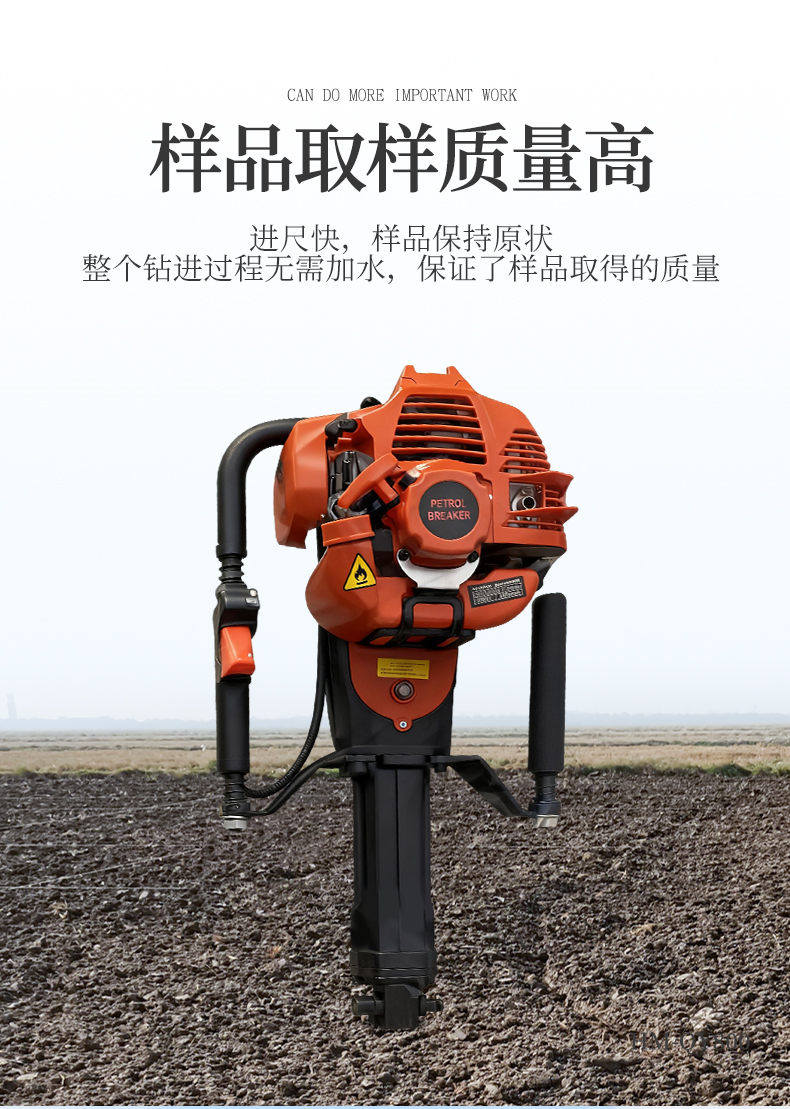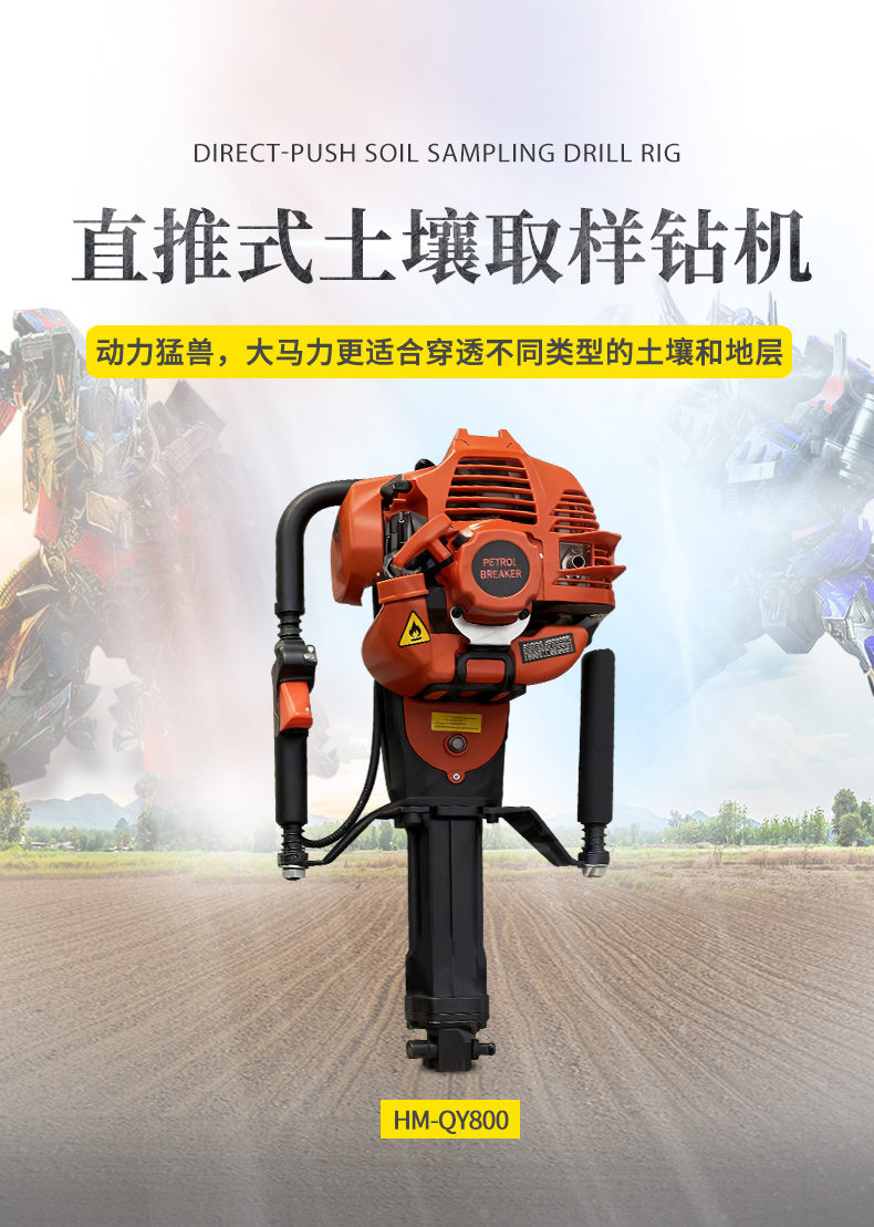 HM-QY800单人手持式土壤取样钻机是在参考大型液压、汽油、气动钻机的基础上设计的一款轻便的土壤采集钻机。即使没有操作经验的钻探人员,简单培训就可操作。取样过程及其简单,1到2个人即可完成设备的操作。整个钻进过程无需加水,保证了样品取得的质量(无污染、无扰动)。