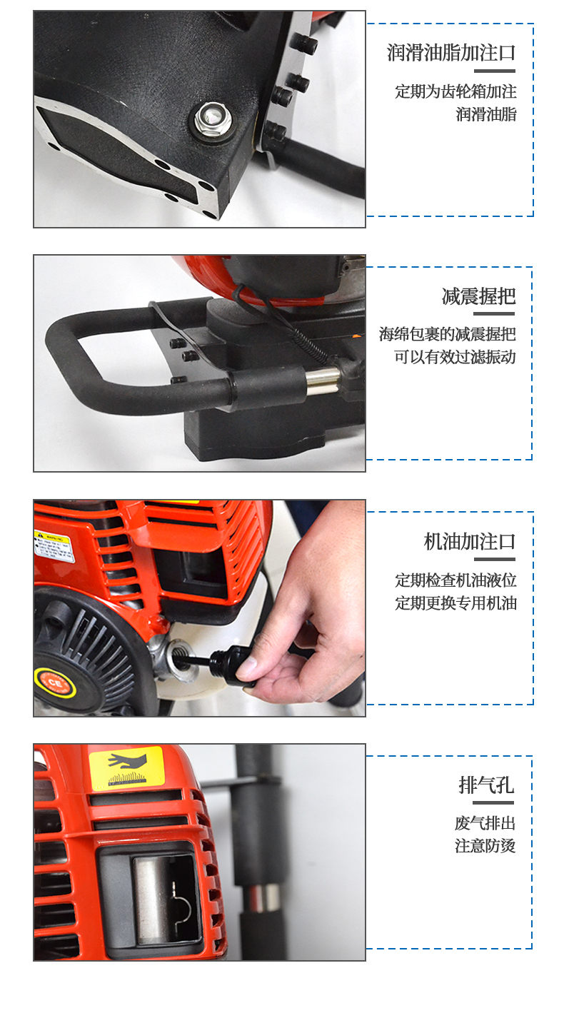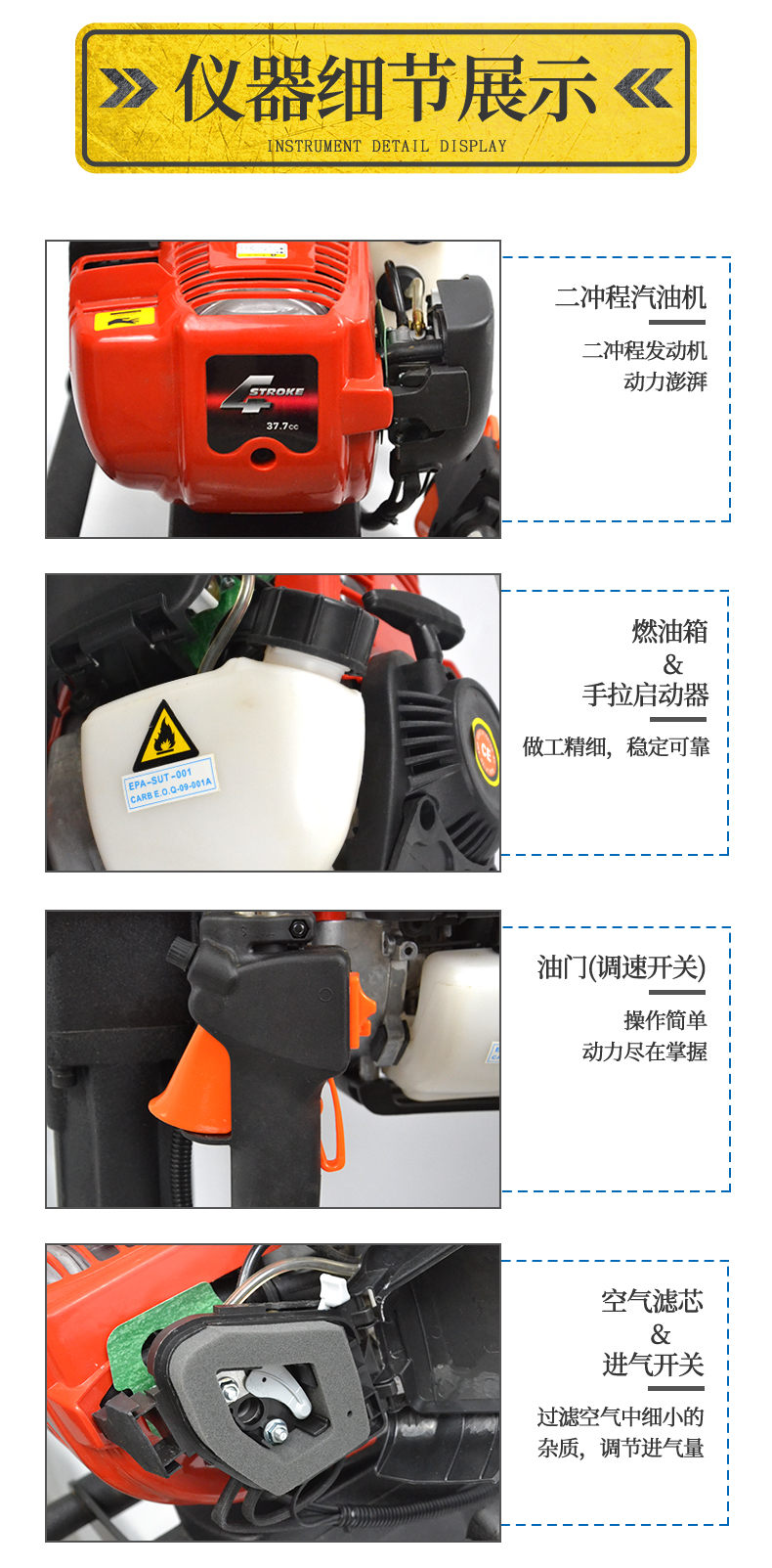 ● 手拉式启动,即停触发按钮,弹簧隔离抗震手柄!