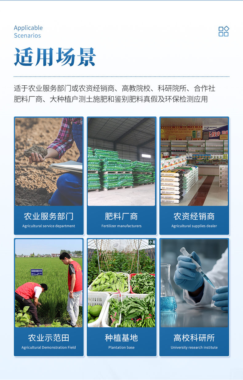 配套齐全:该仪器无需用户自配附件,相当于一个小型实验室。适于农业服务部门或农资经销商、合作社、肥料厂商、大种植户测土施肥。