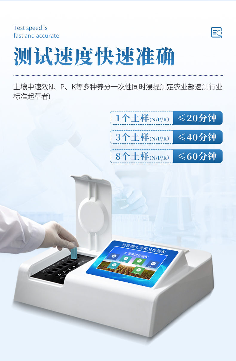 测试速度:正常熟练程度下,测一个土壤样品(N、P、K)三项需要20分钟(含药剂准备及土样前处理时间),同时检测三个土壤样品(N、P、K)≤40分钟,同时测8个土样≤1小时。